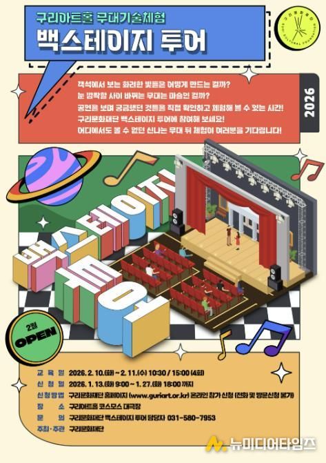 구리문화재단은 〈무대 기술 체험 백스테이지 투어 프로그램〉 참가자를 오는 1월 13일 오전 9시부터 1월 27일 오후 6시까지 재단 홈페이지를 통해 선착순 모집한다고 밝혔다.