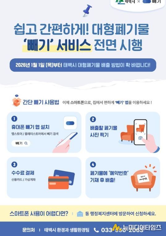 태백시는 2026년 1월 1일부터 대형폐기물 배출 신청부터 수수료 결제, 처리 결과 확인까지 전 과정을 스마트폰 앱 ‘빼기’를 통해 원스톱으로 처리할 수 있는 서비스를 본격 시행한다고 밝혔다.