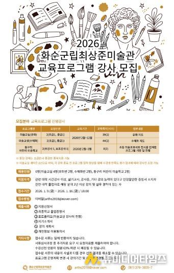 화순군은 화순군립최상준미술관(화순읍 동구리에 위치)에서 2026년 미술 교육 프로그램을 함께 운영할 전문 강사를 1월 9일부터 1월 16일까지 모집한다고 밝혔다.