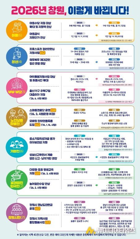 한편, '2026년 달라지는 시책' 책자는 각 읍·면·동 행정복지센터 민원대에 비치될 예정이며, 전자책(e-book) 형태로도 발간돼 창원시 홈페이지(시정소식→주요시정→2026년 달라지는 시책)에서 세부내용을 확인할 수 있다.