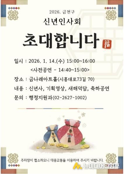 금천구는 오는 14일 오후 3시 금나래아트홀에서 병오년(丙午年, 붉은 말의 해) 새해를 맞아 금천의 도약과 번영을 기원하는 ‘2026년 금천구 신년인사회’를 개최한다고 밝혔다.