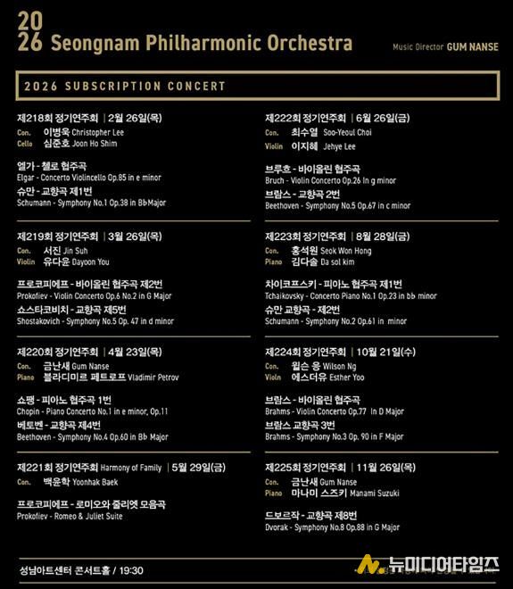 2026년 총 8회 정기공연 라인업을 확정하고, 1월 12일 오후 2시 시즌권을 놀(NOL) 티켓을 통해 오픈한다. 성남시향의 예술총감독 금난새 지휘자를 비롯하여 이병욱, 서진, 백윤학, 최수열, 홍석원, 윌슨 응의 지휘와 첼리스트 심준호, 바이올리니스트 유다윤, 피아니스트 블라디미르 페트로프, 바이올리니스트 이지혜, 피아니스트 김다솔, 바이올리니스트 에스더유, 피아니스트 마나미 스즈키 등의 화려한 협연자를 초청하여 올해 최고의 정기연주회를 마련한다.