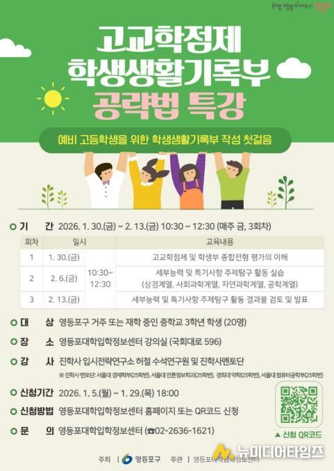 영등포구가 고교 진학을 앞둔 예비 고등학생을 대상으로 ‘고교학점제·학생생활기록부 공략법’ 특강을 열고, 2029학년도 대학 입시에 대비한 학생부 종합전형 준비 전략을 제시한다고 밝혔다.