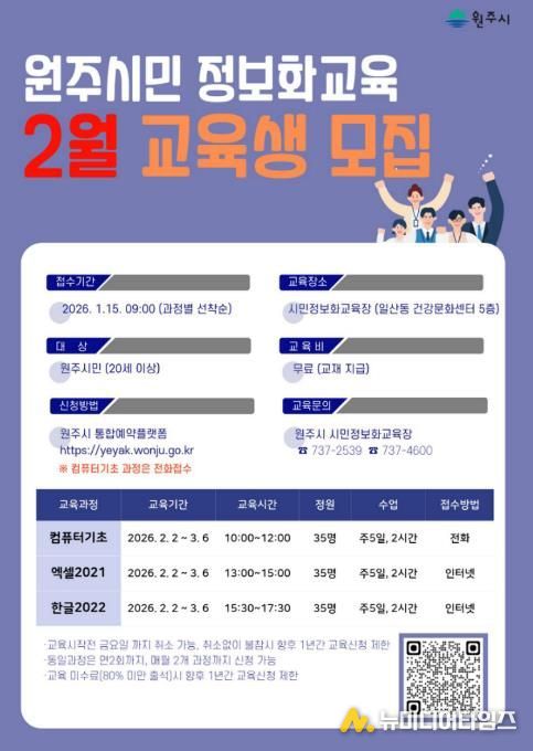 원주시는 시민들의 디지털 활용 능력 향상과 정보 격차 해소를 위해 시민정보화교육 2월 수강생을 모집한다.