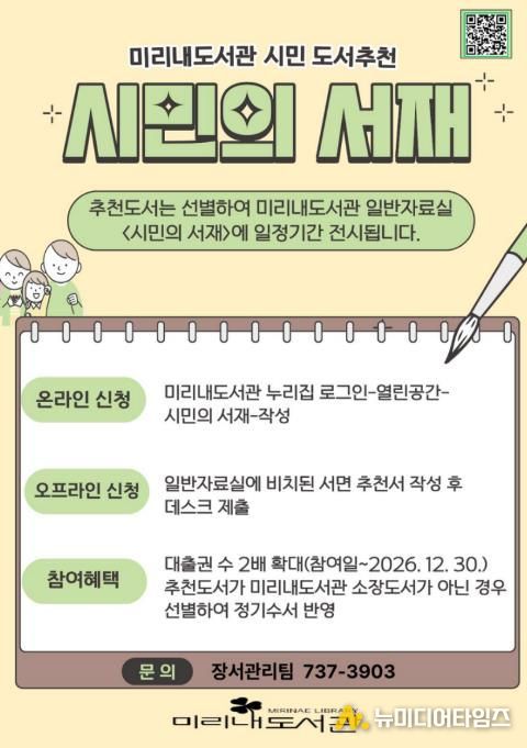 추천된 도서는 선별 과정을 거쳐 도서관 정기 수서에 반영된다. 참여자에게는 올 한 해 동안 대출 권수가 두 배로 확대되는 혜택이 주어진다. 자세한 사항은 미리내도서관 장서관리팀으로 문의하면 된다.