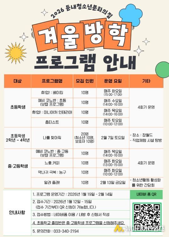 둔내청소년문화의집이 다가오는 겨울방학을 맞아 지역 청소년들의 소질 계발과 유익한 여가 선용을 위한 ‘2026년 겨울방학 프로그램’ 수강생을 모집한다.
