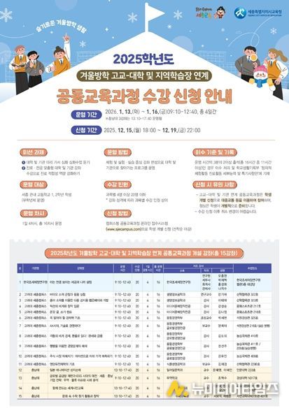 세종특별자치시교육청은 2025학년도 겨울방학을 맞아 고교–대학 및 지역학습장 연계 공동교육과정을 1월 13일부터 1월 16일까지 4일간 고려대학교 세종캠퍼스, 충남대학교, 한국조세재정연구원 등 3개 기관에서 운영한다.