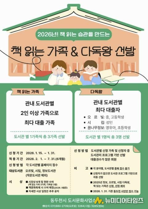 동두천시 도서문화사업소는 오는 1월 15일부터 31일까지 관내 시민을 대상으로 ‘책 읽는 가족’과 ‘다독왕’ 선발을 위한 참여자 신청을 받는다.