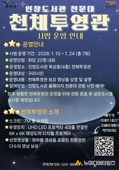 구리시는 오는 1월 13일부터 24일까지 인창도서관 옥상에 설치된 천체투영관의 시범운영을 실시한다고 밝혔다.