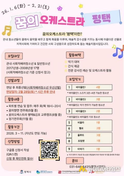 평택시가 (재)평택시청소년재단에 위탁 운영하고 있는 평택시청소년문화센터는 관내 청소년을 대상으로 클래식 음악 교육을 통해 예술적 감수성과 협동심을 기르는 ‘꿈의 오케스트라 평택’2026년 신규단원을 모집한다고 밝혔다.