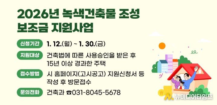 안양시는 높은 에너지 효율 달성 및 온실가스 배출 저감을 위해 노후한 건축물의 보수공사 비용을 지원하는 ‘2026년 녹색건축물 조성 보조금 지원사업’을 추진한다고 12일 밝혔다.