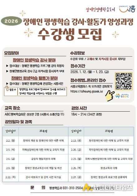 시흥시는 오는 1월 23일까지 ‘2026년 장애인 평생학습 전문 강사와 활동가 양성 과정’ 수강생을 모집한다.