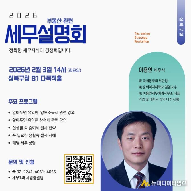 2월 3일 성북구청 지하1층 다목적홀에서 '2026년 부동산관련 세무 설명회'로 부동산 세금에 관심 있는 구민 250명을 선착순으로 모집해 진행한다.