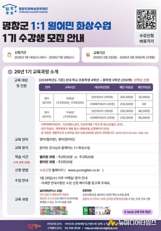 재단법인 평창인재육성장학재단은 농촌지역의 지리적 한계를 넘어 수준 높은 어학 교육 환경을 제공하기 위해 오는 14일부터 28일까지‘2026 원어민 화상영어’ 참여자 모집에 나선다.