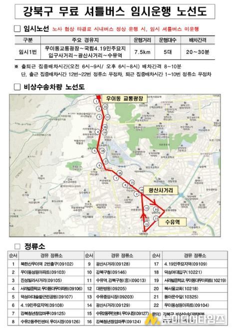 비상수송대책의 핵심으로, 구는 ‘임시 무료 셔틀버스(임시 1번)’를 운영하고 있다. 셔틀버스는 우이동 교통광장에서 수유역까지 약 7.5km 구간을 운행하며, 전세버스 10대가 투입돼 오전 6시부터 밤 10시까지 운행된다.