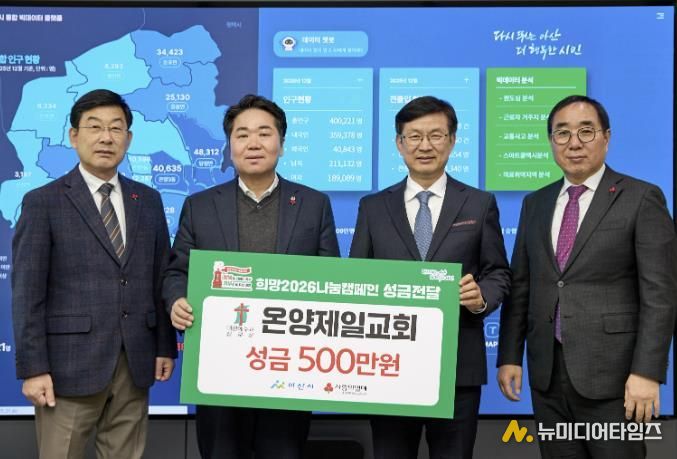 온양제일교회는 지난 13일 아산시를 방문해 희망2026나눔캠페인에 참여하여 성금 500만 원을 기탁했다. 이번 성금은 교인들의 자발적인 참여와 기도로 마련된 것으로 경제적 어려움을 겪고 있는 지역 내 취약계층을 지원하는 데 사용될 예정이다.