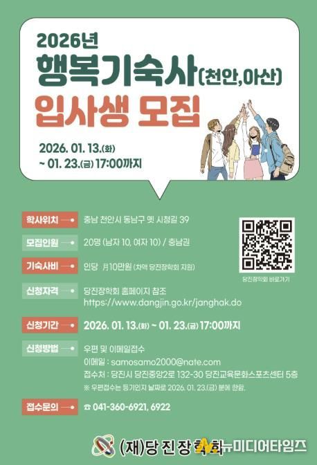 당진시는 충남에 있는 대학을 다니는 당진시 대학생을 대상으로 2026년 천안 행복기숙사(동남구 소재) 입사생 20명을 모집한다고 14일 밝혔다.