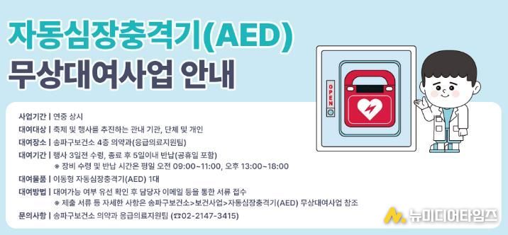 서울 송파구는 예고 없이 발생하는 심정지 사고로부터 구민의 생명을 보호하기 위해 올해부터 ‘이동형 자동심장충격기(AED) 무상 대여 사업’을 본격 시행한다고 14일 밝혔다.