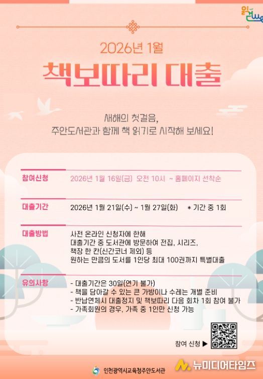 인천광역시교육청주안도서관은 지역주민의 독서문화 정착과 대출 활성화를 위하여 2025년에 이어 올해도 '책 보따리 대출'을 실시한다고 14일 밝혔다.