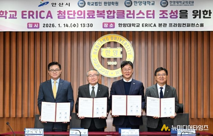 안산시는 14일 오후 한양대학교 ERICA 프라임컨퍼런스홀에서 학교법인 한양학원, 한양대학교, 한양대의료원과 공동으로 ‘한양대학교 ERICA 첨단의료복합클러스터 조성을 위한 업무협약’을 체결했다고 밝혔다.