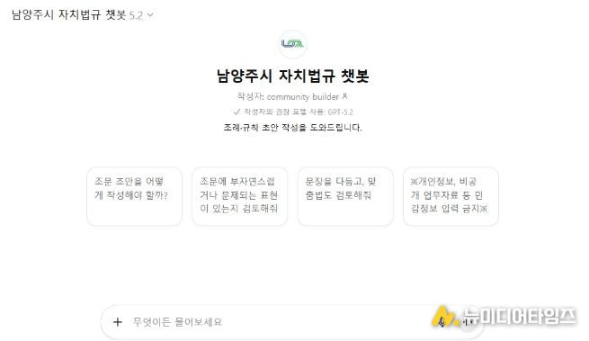 남양주시는 이달부터 전 직원을 대상으로 자치법규 업무를 지원하는 생성형 인공지능(AI) 기반 ‘남양주시 자치법규 챗봇’ 운영을 시작했다고 14일 밝혔다.