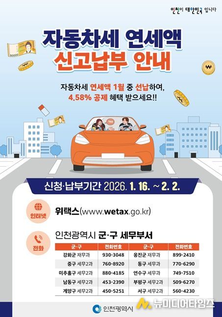 신청 대상은 2026년 1월 1일 기준 인천시에 등록된 자동차 소유자이며, 신청 방법은 거주지 관할 군·구 세무부서 방문 또는 전화 접수, 위택스 누리집 및 ‘스마트 위택스’ 모바일 앱을 통한 온라인 신청이 가능하다.