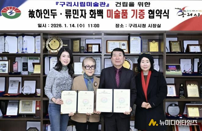 구리시는 지난 14일 시청 3층 시장실에서 ‘구리시립미술관 건립을 위한 작품 기증 협약식’을 개최했다. 이번 협약식은 한국 현대미술사의 거장 고(故) 하인두 화백의 작품 80점과 류민자 화백의 작품 25점을 기증받고, 문화예술 교류 협력을 공식화하기 위해 마련됐다.