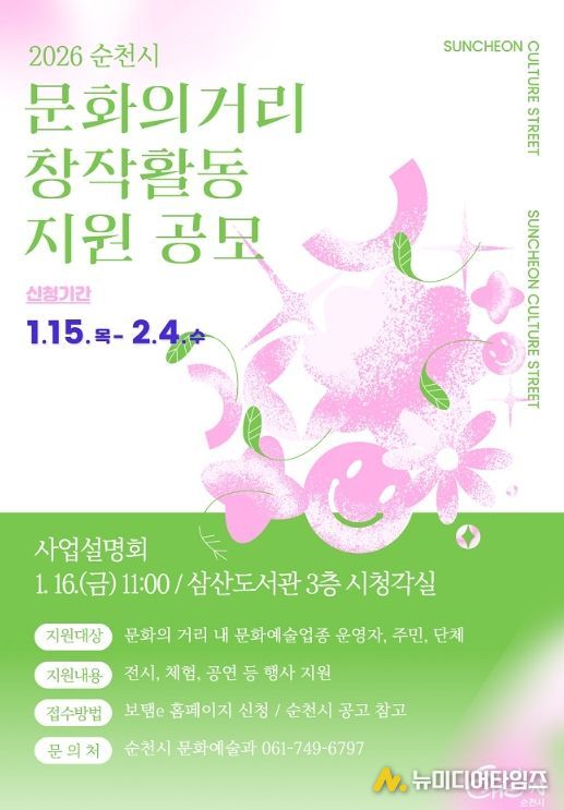 순천시는 문화의 거리를 예술특화 거점지역으로 육성하고 지역 예술인의 지속가능한 창작활동을 지원하기 위해 ‘2026년 순천시 문화의 거리 창작활동 지원사업’ 참여자를 공개 모집한다고 밝혔다.