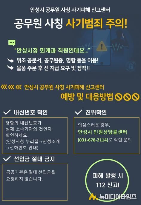 안성시 관계자는 “안성시 공무원은 어떠한 경우에도 선입금을 요구하지 않는다”며 “수상하거나 의심스러운 연락을 받았을 경우, 즉시 신고센터로 문의해 달라”고 당부했다.