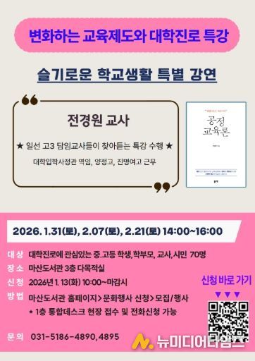 김포시 마산도서관이 1월 31일, 2월 7일, 2월 21일 2월 21일 3회에 걸쳐 오후 2시부터 4시까지 ‘변화하는 교육환경(슬기로운 학교생활)’에 관심이 있는 중고등학교 학부모, 교사, 학생 등 김포시민을 대상으로 특별강연을 운영한다.