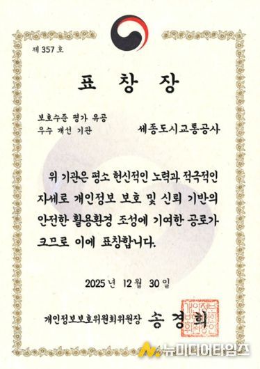 세종도시교통공사 도순구 사장은 “이번 우수 개선 기관 선정은 전년도 평가 결과를 철저히 분석하고, 전사적인 개선 노력을 지속해 온 결과”라며, “앞으로도 개인정보 보호를 공사의 핵심 가치로 삼아 시민의 소중한 개인정보를 더욱 안전하게 보호하고, 신뢰받는 공공기관으로 자리매김하겠다”고 밝혔다.
