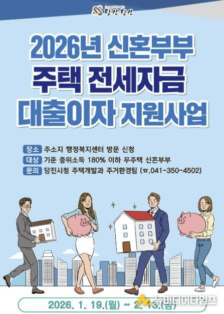 당진시는 1월 19일부터 2월 13일까지‘2026년 신혼부부 주택 전세자금 대출이자 지원사업’ 신청자를 모집한다고 16일 밝혔다.