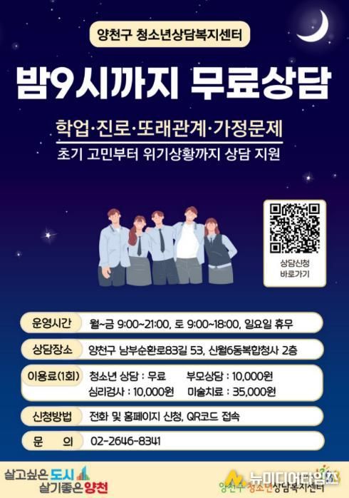 양천구가 심리적·정서적 어려움을 겪고 있는 청소년의 건강한 성장을 돕기 위해 마음건강 지원 강화에 나섰다. 올해부터 청소년상담복지센터 개인상담 서비스를 전면 무료화하고, 평일 밤 9시까지 연장 운영에 돌입한다.