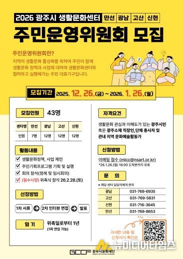 (재)광주시문화재단은 광주시 생활문화센터(만선·광남·고산·신현)에서 2026년에 활동할 주민운영위원회 위원을 통합 공개 모집한다고 밝혔다.