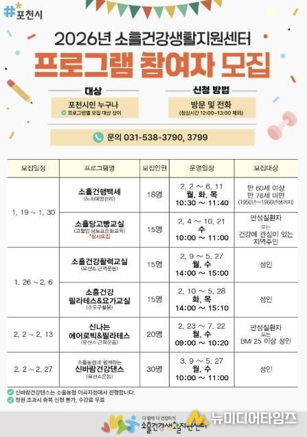 포천시 소흘건강생활지원센터는 시민들의 건강 증진과 활기찬 일상 지원을 위해 오는 19일부터 ‘2026년 상반기 건강증진 프로그램’ 참여자를 모집한다.