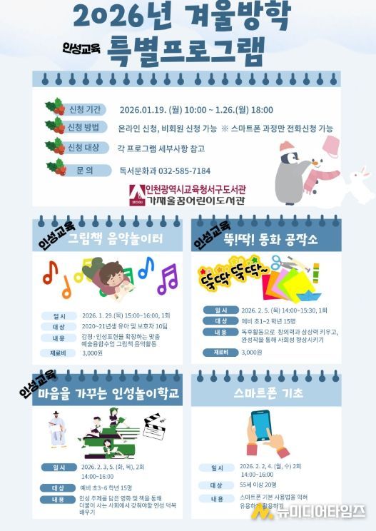 인천광역시교육청서구도서관은 ‘2026년 겨울방학 특별프로그램’ 학습자를 19일 오전 10시부터 선착순으로 모집한다.