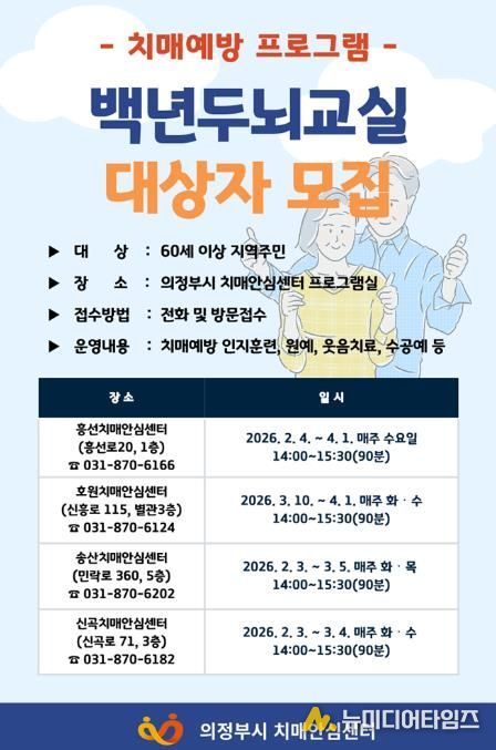 의정부시 보건소 치매안심센터는 치매 예방과 인지기능 유지‧향상을 위한 2026년 상반기 치매예방 프로그램 ‘백년두뇌교실 1기’를 운영한다.