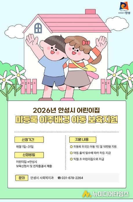안성시 관계자는 “돌봄 공백 속에 방치될 우려가 있는 미등록 이주배경 아동들이 보육돌봄의 기회를 제공받게 됐다”며 “보육비 부담을 덜고, 모든 아동이 건강하게 성장할 수 있는 포용적 보육환경 조성에 힘쓰겠다”고 말했다.