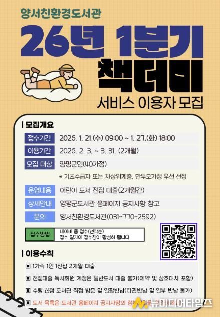모집 대상은 양평군 도서관 대출회원 중 어린이 자녀를 둔 40가정이며, 기초생활수급자 및 차상위계층, 한부모 가정은 우선 선정 대상에 포함된다. 신청은 1월 21일 오전 9시부터 온라인(네이버 폼)을 통해 선착순으로 진행된다.