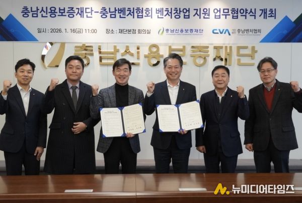 충남신용보증재단은 16일 충남벤처협회와 충남신보 본점에서 조소행 이사장과 남승일 회장을 비롯한 양 기관 주요 관계자들이 참석한 가운데, 예비창업자 및 유망 벤처기업 지원 강화를 위한 업무협약을 체결했다고 밝혔다.