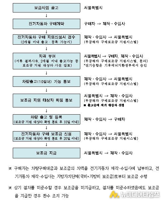 구매희망자는 자동차 제작·수입사와 계약을 체결하고, 제작·수입사가 서울시에 보조금을 신청하면 출고·등록 순으로 지원 대상자가 선정된다. 보조금은 차량 출고 및 등록 후 서울시가 제작·수입사에 직접 지급하며, 구매자는 보조금을 제외한 금액만 납부하면 된다.