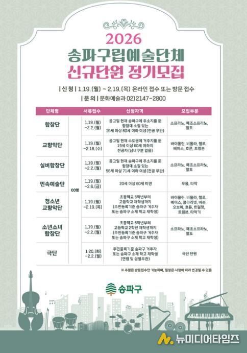 모집 기간은 단체별로 상이하며, 최대 2월 19일까지다. 입단을 희망하는 구민은 송파구청 홈페이지 고시·공고란에서 단체별 자격 조건과 모집 부문을 확인한 후, 응시 서류를 작성해 이메일로 제출하거나 송파구청 문화예술과로 방문 접수하면 된다.