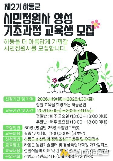 모집 인원은 50명, 모집 기간은 1월 19일부터 30일까지이며, 정원에 관심이 있는 하동군민이라면 누구나 신청할 수 있다.