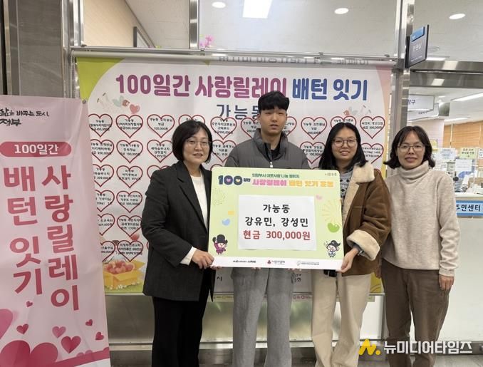 경민고에 재학 중인 강유민‧강성민 남매는 자신의 용돈을 모아 지난 3년 동안 가능동 주민센터에 기부를 이어왔다. 특히, 첫째 강유민 양은 올해 수능을 치르고 대학 입시를 준비하는 바쁜 시기에도 불구하고 지역 내 어려운 이웃을 잊지 않고 손수 성금을 기탁했다.