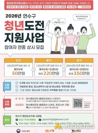 연수구는 청년들의 경제 활동과 노동시장 진입을 돕기 위해 ‘2026년 청년도전지원사업’ 참여자를 모집한다.