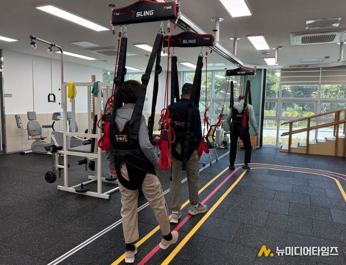 이 프로그램은 슈트를 착용한 후 레일을 따라 걷고, 슬링을 활용한 운동을 통해 신체 기능 회복과 근력 강화, 균형 능력 향상을 돕는다.