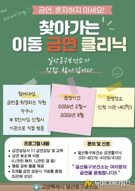 고양특례시 일산동구보건소는 보건소 방문이 어려운 직장인 흡연자를 대상으로 ‘찾아가는 금연클리닉’을 운영한다고 19일 밝혔다.