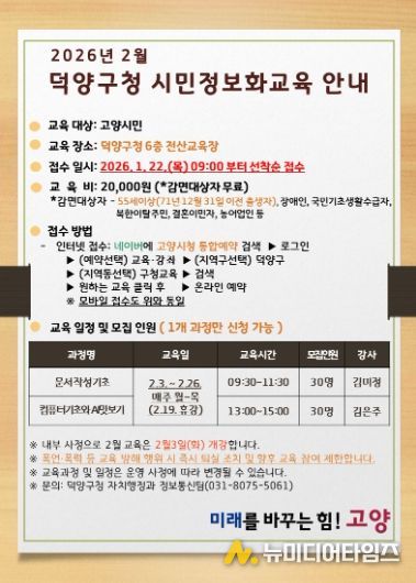 고양특례시 덕양구는 고양시민의 디지털 역량 강화를 위해 ‘2026년 제1차 덕양구 시민정보화교육’ 수강생을 오는 22일부터 모집한다고 밝혔다.