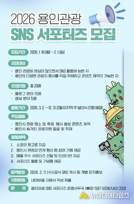 용인특례시는 2월 1일까지 용인의 관광자원과 다채로운 축제·행사를 시민의 시각에서 생동감 있게 홍보할 ‘용인관광 SNS 서포터즈’를 모집한다고 20일 밝혔다.
