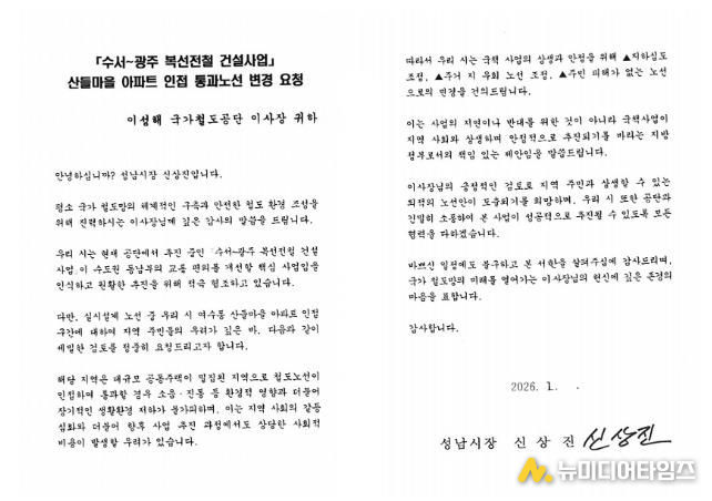 성남시는 지난 16일 김윤덕 국토교통부 장관과 이성해 국가철도공단 이사장에게 ‘수서~광주 복선전철(이하 수광선) 건설사업’과 관련하여 여수동 산들마을 아파트 인접 통과 구간의 노선 변경을 요청하는 서한을 전달했다고 20일 밝혔다.